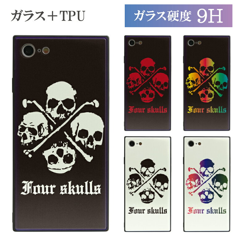 No219 Four Skulls レクタングル iPhone対応 ガラスケース iPhone X iPhone8 iPhone7 スマホケース 持ちやすい 強化ガラス クール 派手 パンク ドクロ スカル ブラック 黒 ホワイト 白 オシャレ 偏光ガラス アイホンX d:coo